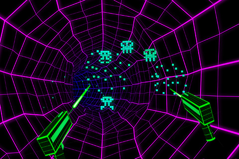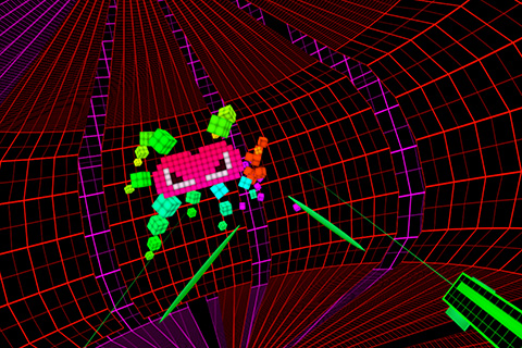 In the end-of-level boss games, you should always focus on the objects with a pulsating hue. Track 1 ends with a tentacle equipped creature called Squimpfy. The first part of this boss game is merely score collection. For each tentacle you manage to clear you earn 4000 points. Tentacles are respawned. When the roof comes off, and Squimpfy starts to rise, keep clearing tentacles. After a while Squimpfy will also start to pulsate, and can be shot. When Squimpfy finally is down, you still need to clear all the tentacle pieces flying around you to get the full bonus. If you can't see them, listen carefully for their swooshing sounds.